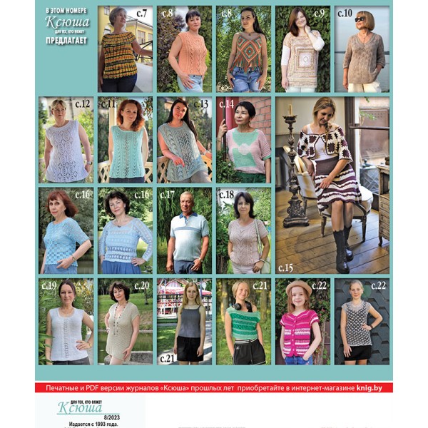 с.7 Топ «Солнечный август» крючком (Рита Кожан), с.8 Топ «Рыжик» спицами (Елена Панина), с.8 Топ «Восточные страсти» крючком (Лаура Малик-Степанова), с.9 Туника крючком (Рита Кожан), с.10 Туника «Виктория» на спицах (Галина Лепешко), с.12 Туника «Бель» на спицах (Инна Тищенко), с.11 Топ «Нежность» на спицах (Инна Тищенко), с.13 Туника «Голубой бриз» спицами (Инна Тищенко), с.14 Топ крючком (Ирина Хорн), с.15 Комплект: жакет и юбка крючком (Оксана Павлова), с.16 Голубой топ крючком (Валентина Бондарева), с.16 Ажурный джемпер «Бриз» крючком (Тамара Марочкина), с.17 Мужская футболка поло на спицах (Светлана Гончаренко), с.18 Топ «Лотос» на спицах (Елена Прилепская), с.19 Топ «Веточка акации» на спицах (Анна Виниченко), с.20 Туника-жилет спицами (Тамара Марочкина), с.21 Топ «Грозовая тучка» спицами (Регина Дворникова), с.21 Топ «Зелень» спицами (Наталья Подыбайло), с.22 Жакет «Пёстрый» крючком (Рита Кожан), с.22 Ажурный топ крючком (Регина Дворникова).