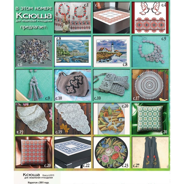 В журнале "Ксюша. Для любителей рукоделия №2019-08" опубликованы модели в различных техниках рукоделия, указанные в содержании.